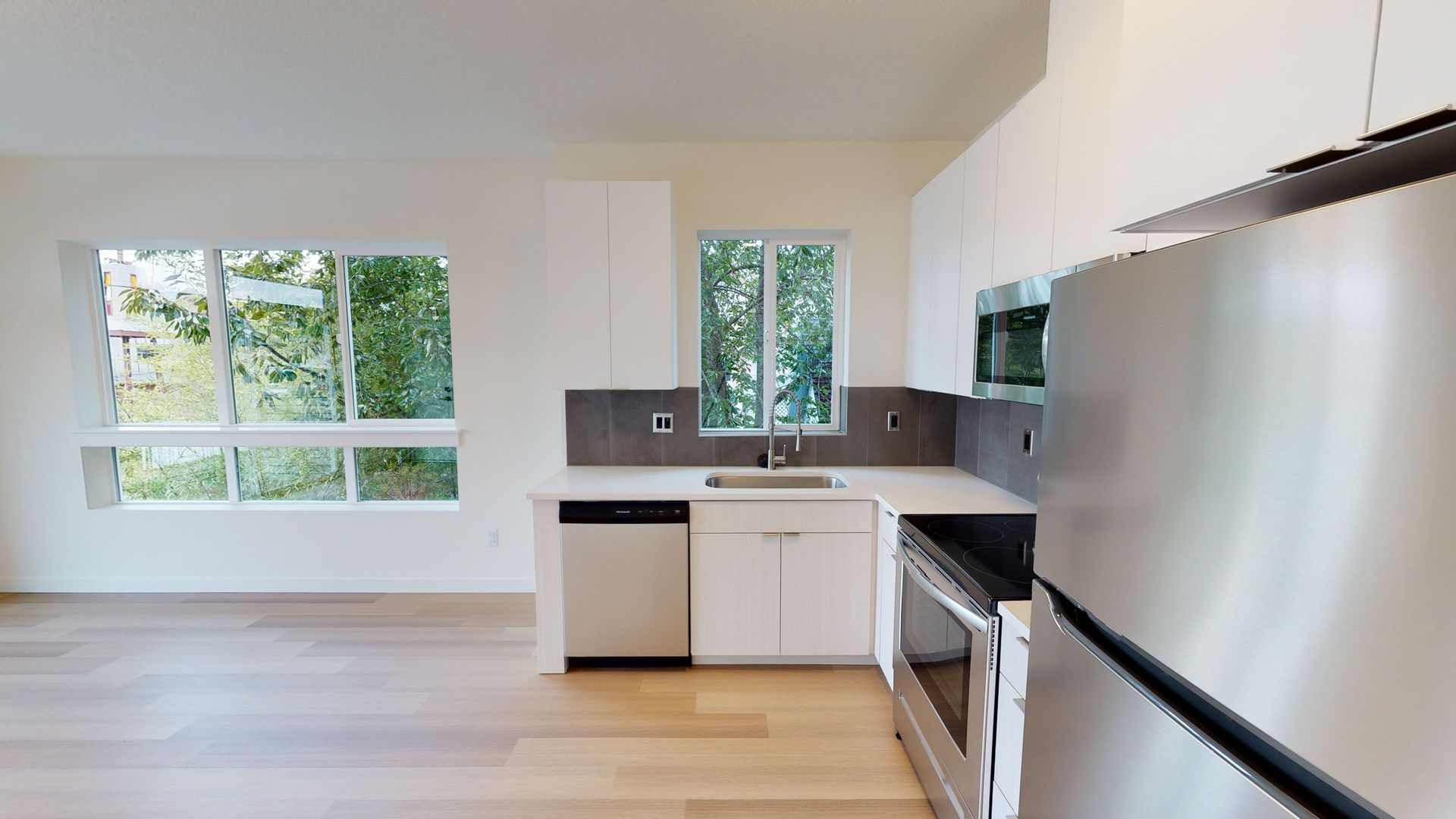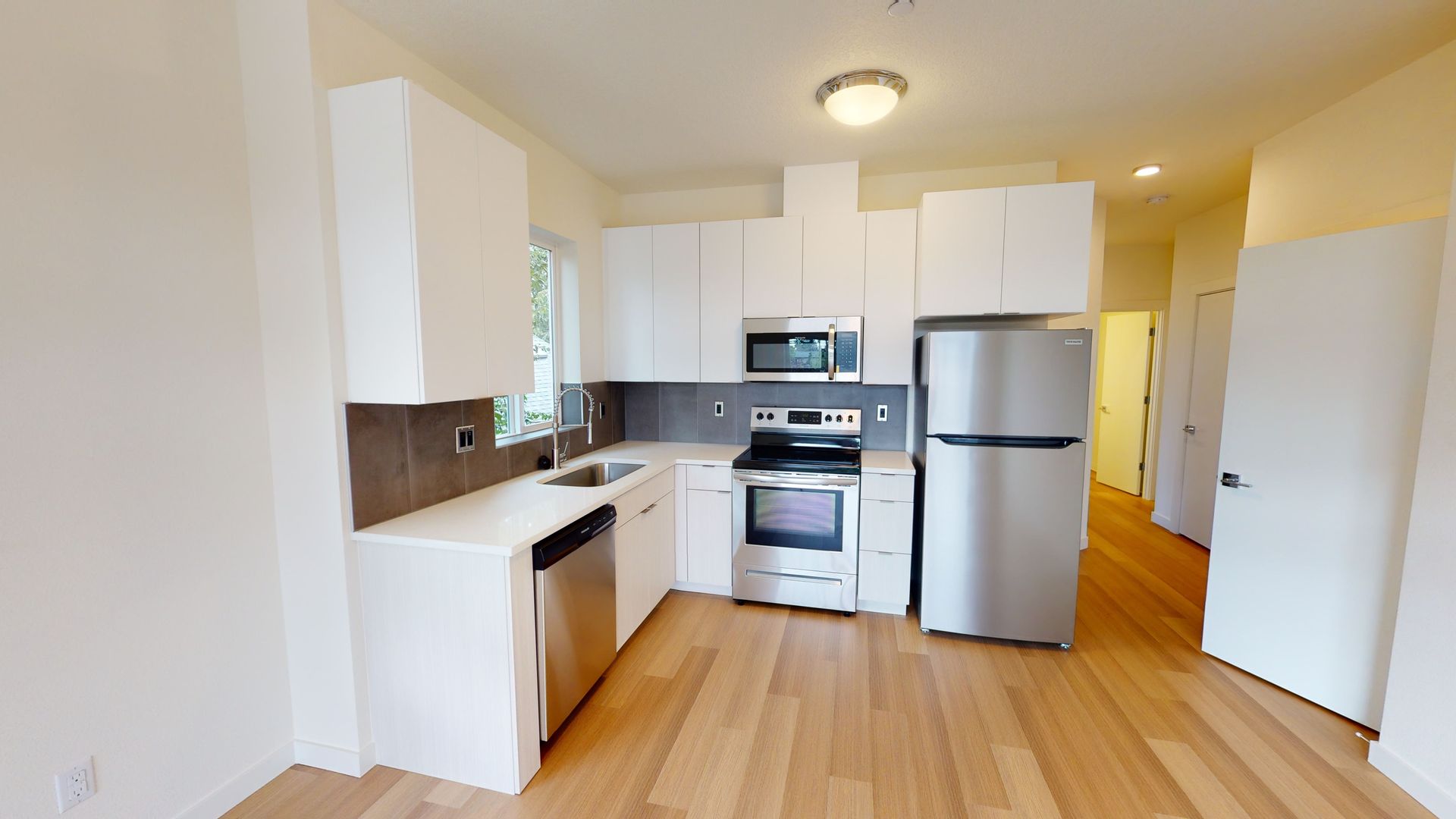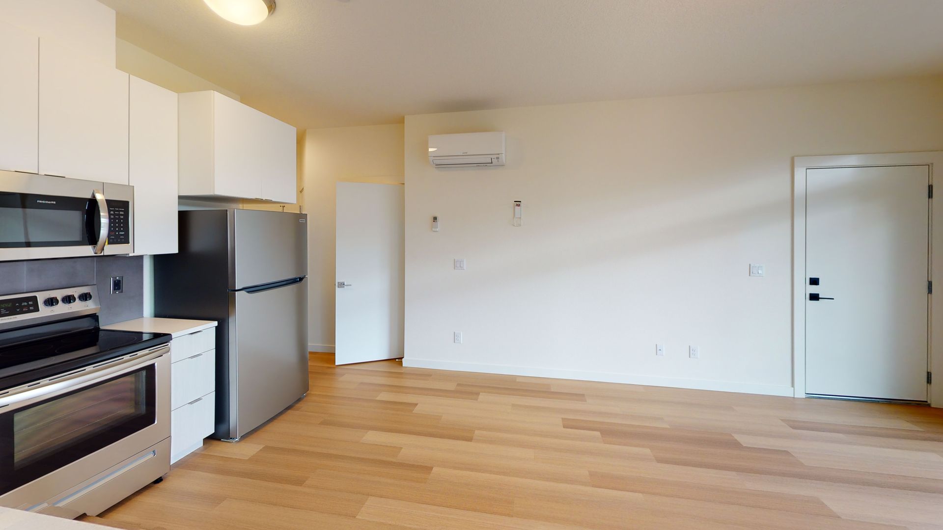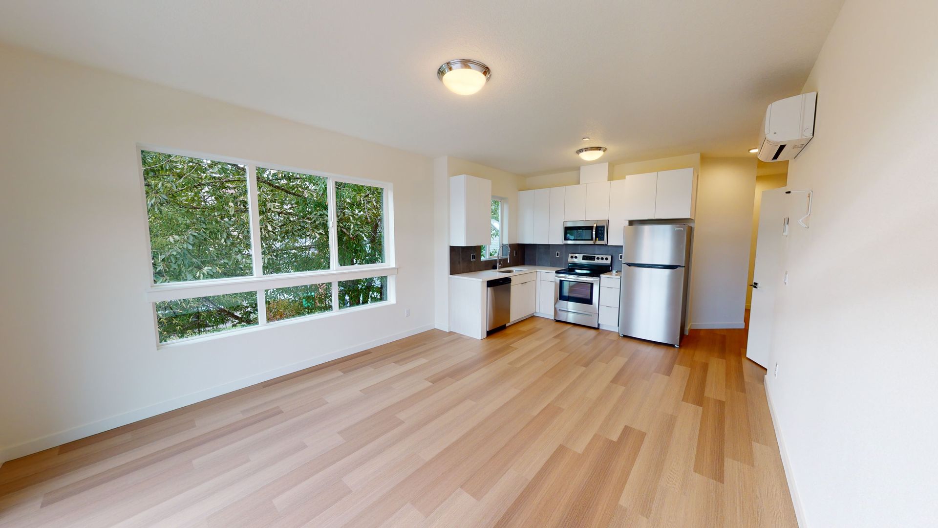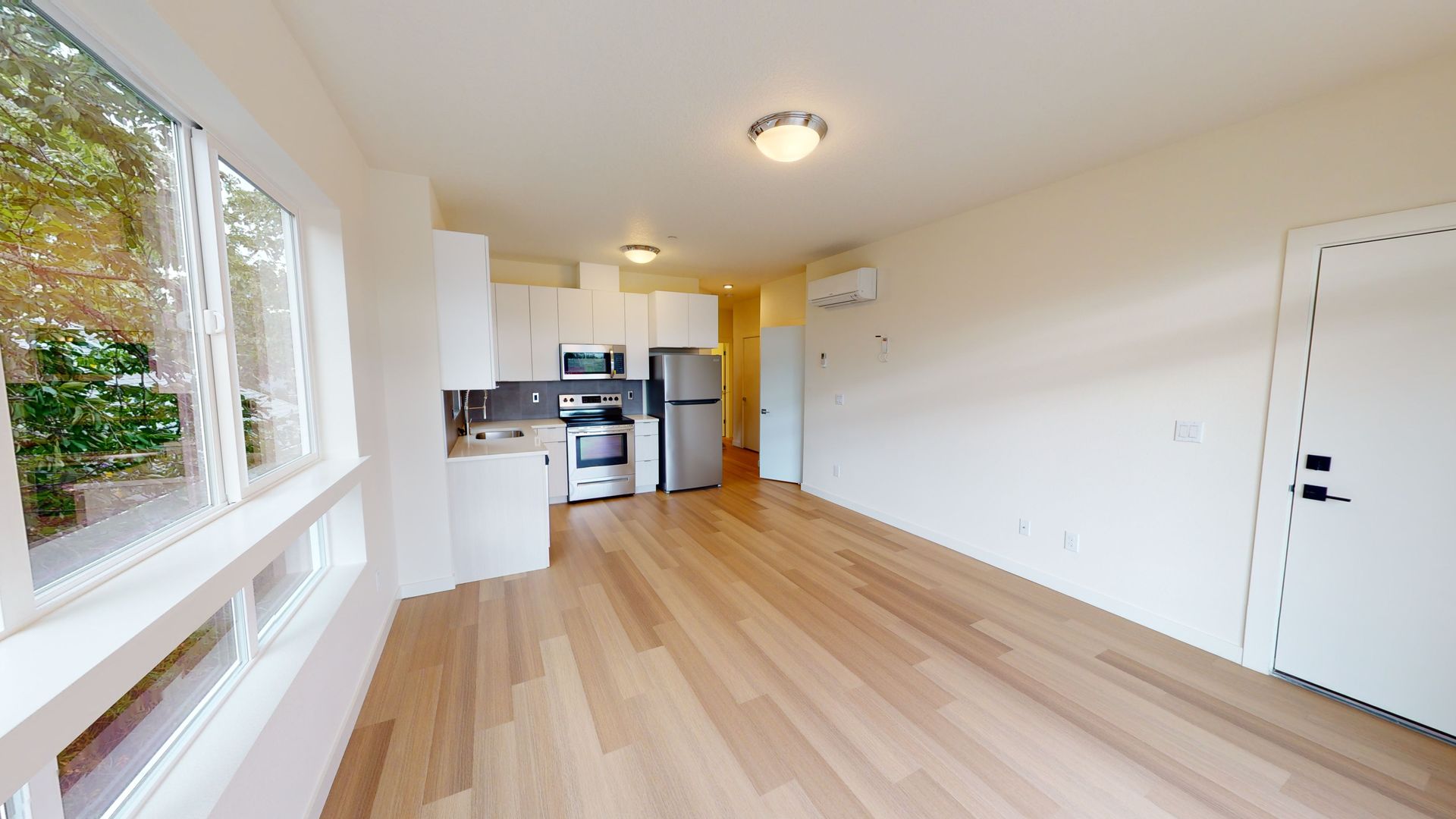 Open room concept. Tall ceilings. Stainless steel appliances. Washer and dryer in unit. Air-conditioning. engineered wood floors. Custom blinds. Bathtub. Microwave.
